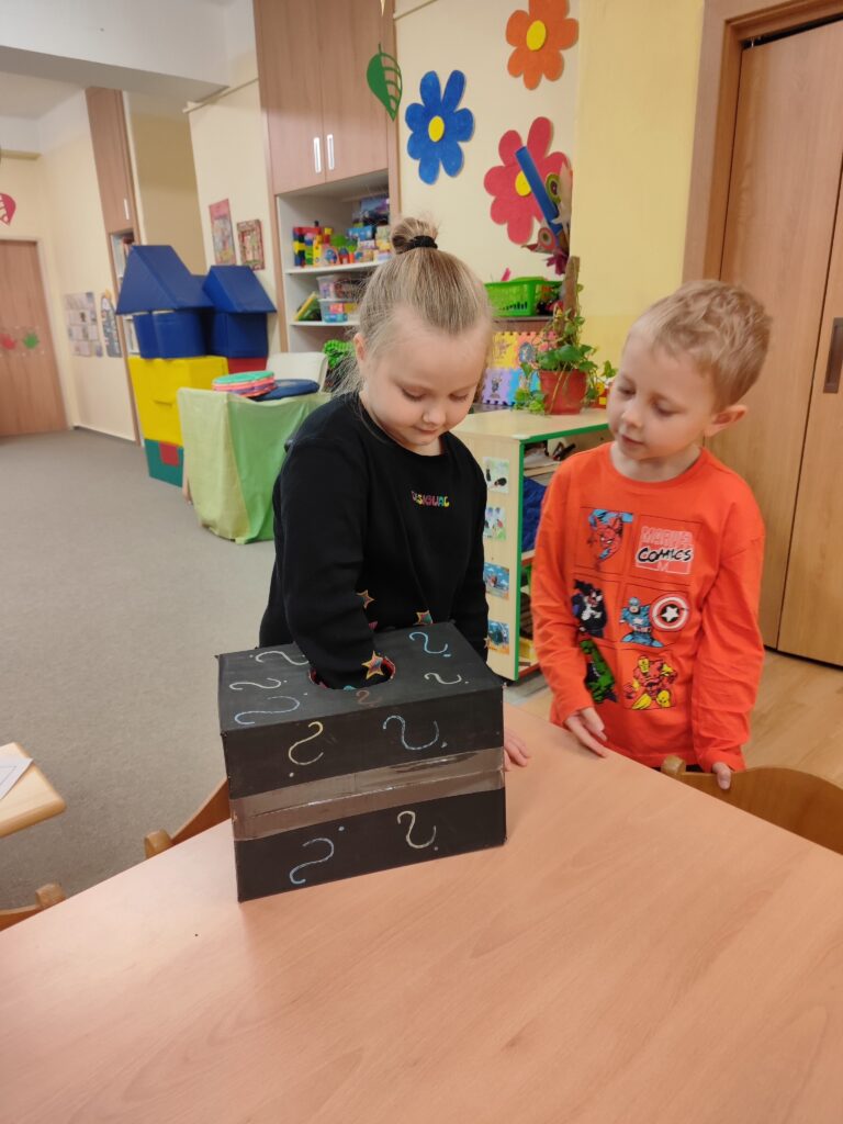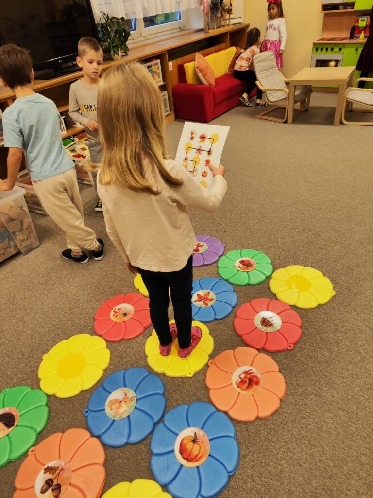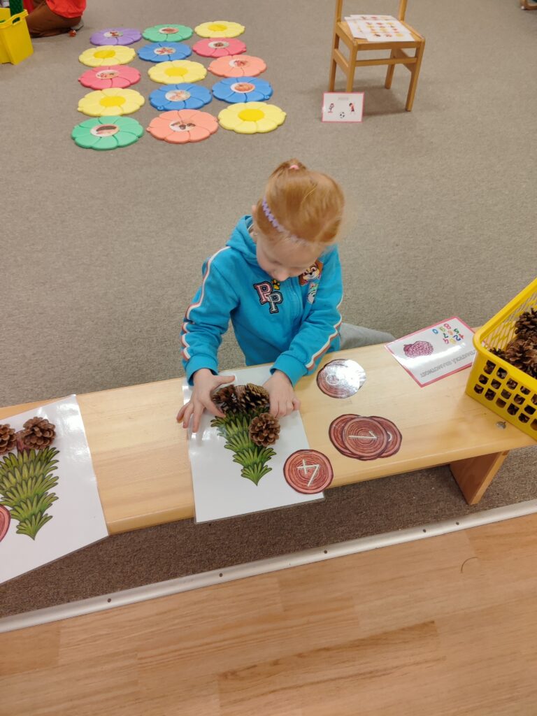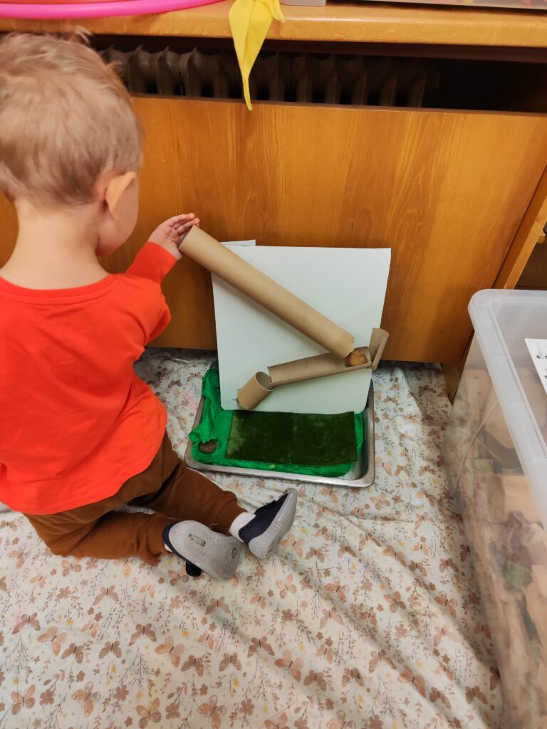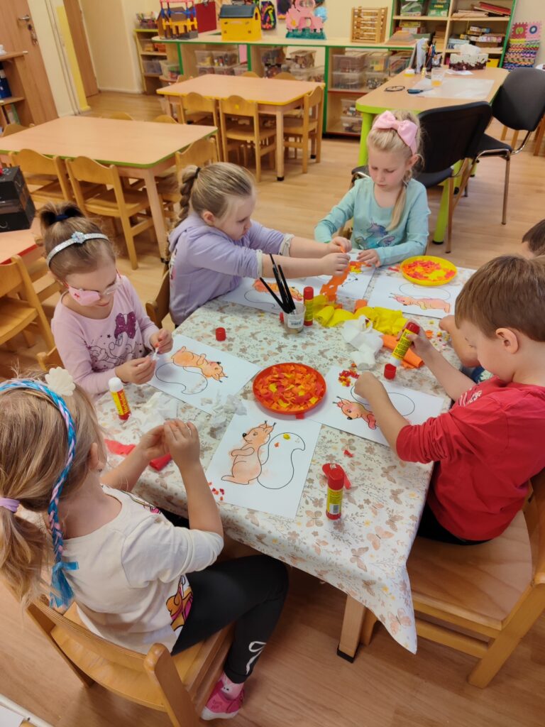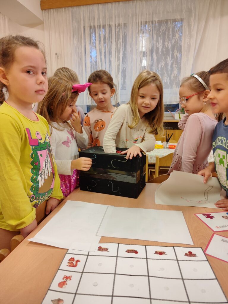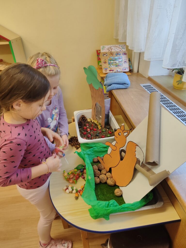 V centru pohybu děti podle znázorněné cesty v mapě hledaly cestu ven z bludiště (cestou pojmenovaly vše, co viděly) – tím jsme rozvíjeli prostorovou orientaci a slovní zásobu. Prostorovou orientaci i s pojmy před, za, na, vedle jsme si procvičili při umisťování ukrytých zvířátek do tabulky. Pak nás čekal les plný jehličnatých stromů, kde jsme umisťovali stanovený počet šišek na strom (aktivitu jsme měli rozdělenou na složitější a jednodušší). Rozruch vzbudila i tajemná krabice, kde byly ukryaty různé předměty a úkolem dětí bylo podle hmatu poznat, co je tam schované. Asi nejoblíbenější centrem byla sensory play aktivita, kde jsme vybírali vhodné potraviny pro veverku, pomocí trubek jsme je pouštěli veverce do úkrytu ve stromu. Ve výtvarném centru nás čekala výroba vlastní veverky. Zkusili jsme si pokus s vodou a krepovým papírem a tím jsme veverce zabarvili tělíčko. Na ocásek jsme použili také krepový papír, ale tentokrát jsme ho trhali a lepily.