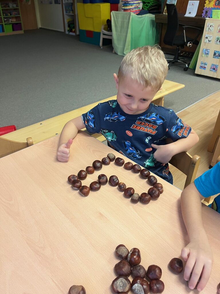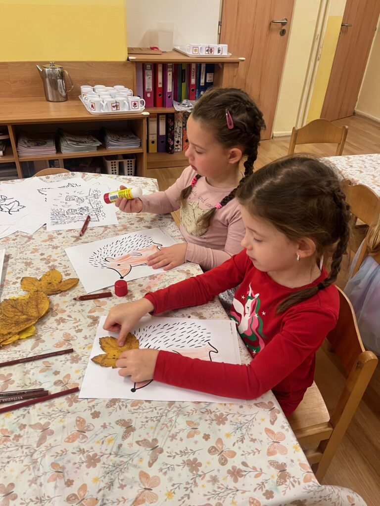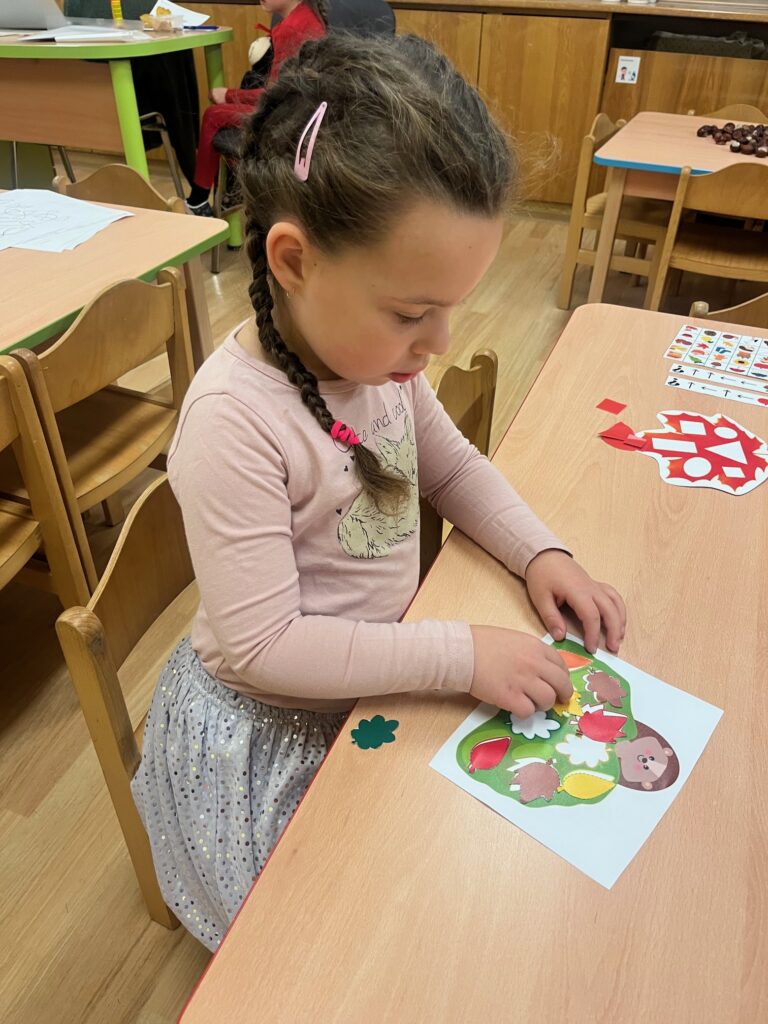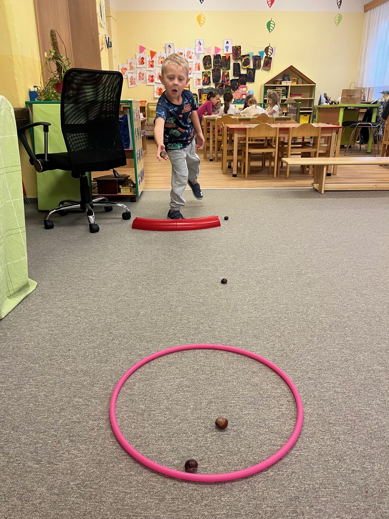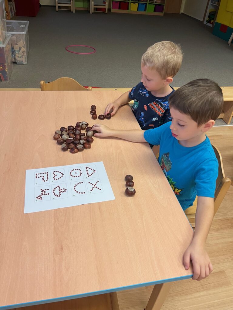 V centru pohybu děti podle znázorněné cesty v mapě hledaly cestu ven z bludiště (cestou pojmenovaly vše, co viděly) – tím jsme rozvíjeli prostorovou orientaci a slovní zásobu. Prostorovou orientaci i s pojmy před, za, na, vedle jsme si procvičili při umisťování ukrytých zvířátek do tabulky a při hledání cesty. V rámci pohybové aktivity děti trénovaly také hod, kdy se snažily trefit kaštanem do určeného místa. Kaštany děti využily také pro stavbu obrazců podle předlohy. Zrakové vnímání děti procvičovaly různámi skládačkami a doplňovačkami s podzimní tématikou. Pak nás čekal les plný jehličnatých stromů, kde jsme umisťovali stanovený počet šišek na strom (aktivitu jsme měli rozdělenou na složitější a jednodušší). Rozruch vzbudila i tajemná krabice, kde byly ukryty různé předměty a úkolem dětí bylo podle hmatu poznat, co je tam schované. Asi nejoblíbenější centrem byla sensory play aktivita, kde jsme vybírali vhodné potraviny pro veverku, pomocí trubek jsme je pouštěli veverce do úkrytu ve stromu. Ve výtvarném centru nás čekala výroba vlastní veverky. Zkusili jsme si pokus s vodou a krepovým papírem a tím jsme veverce zabarvili tělíčko. Na ocásek jsme použili také krepový papír, ale tentokrát jsme ho trhali a lepily. V rámci výtvarných aktivit děti čekala také výroba ježečka s využitím posbíraných listů. Fantazii děti také rozvíjely v průběhu celého týdne prostřednictvím podzimních omalovánek.