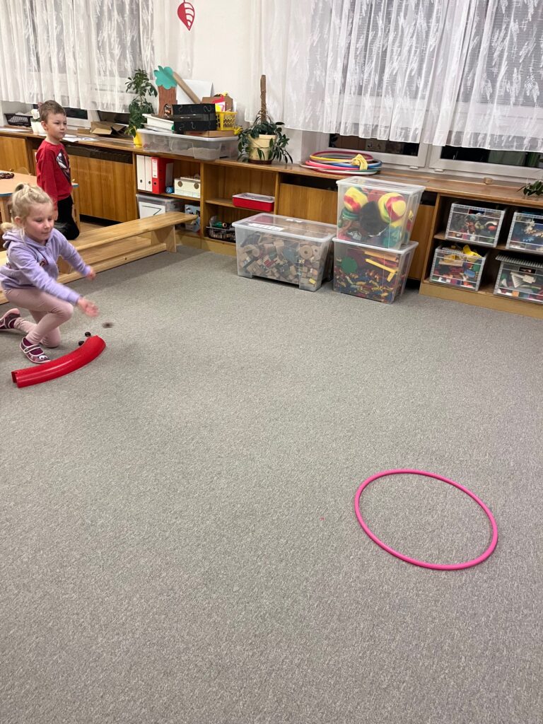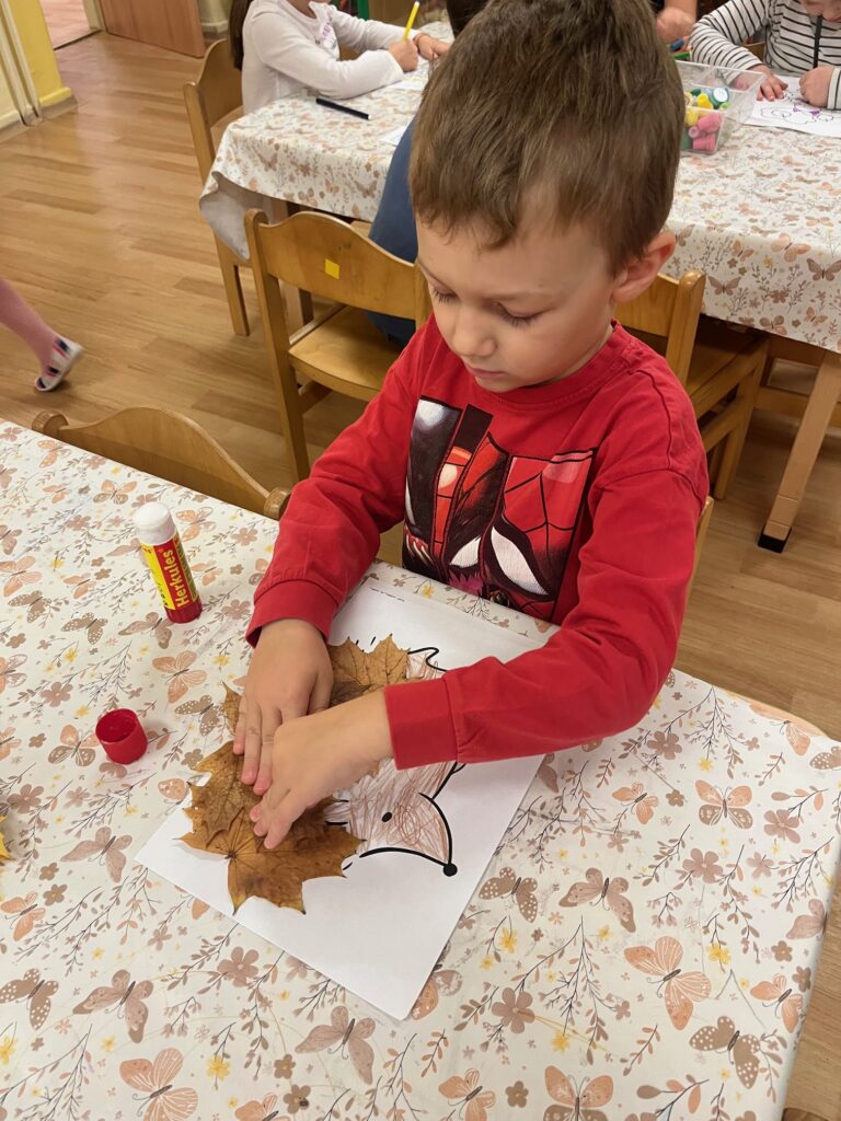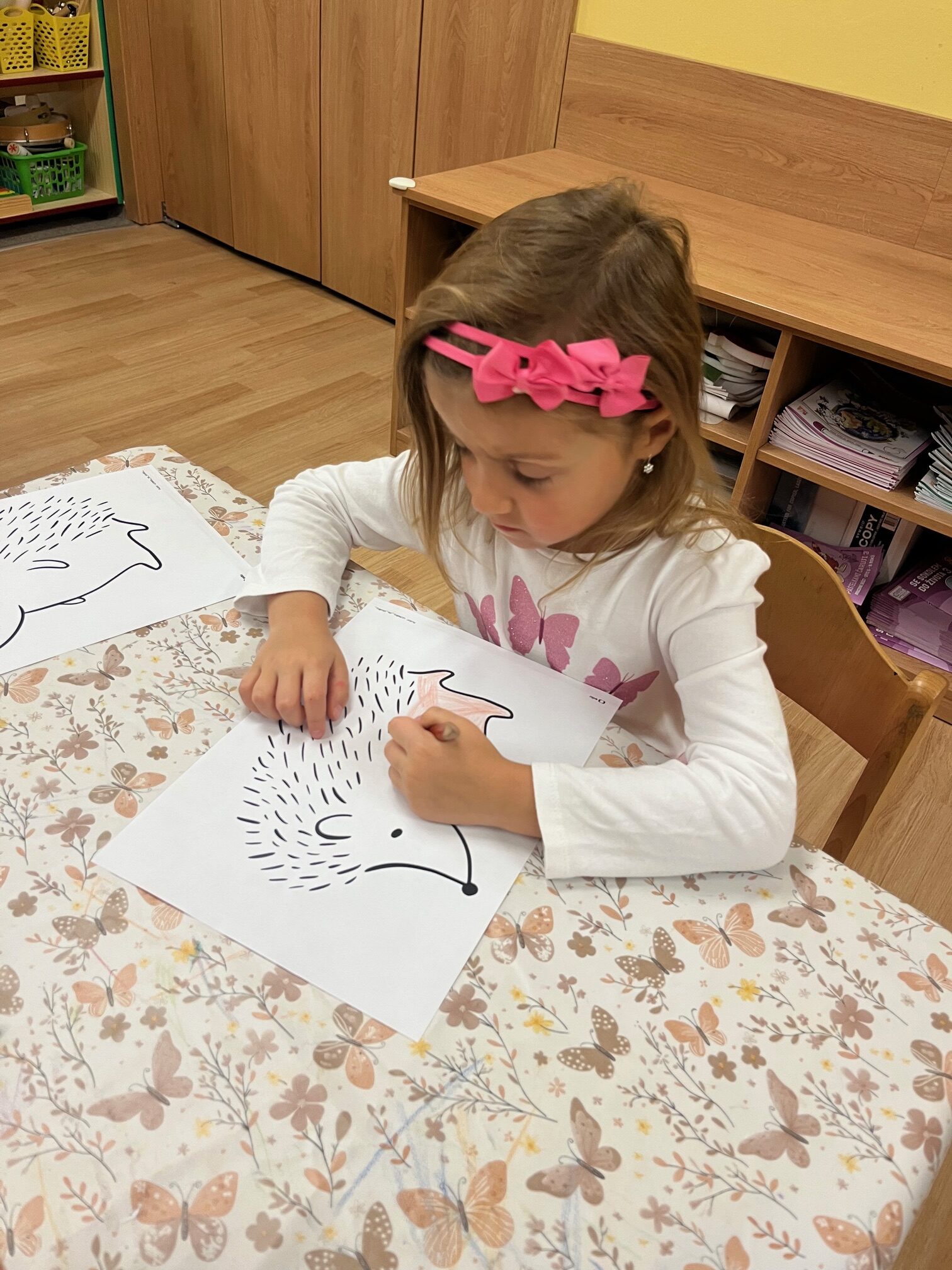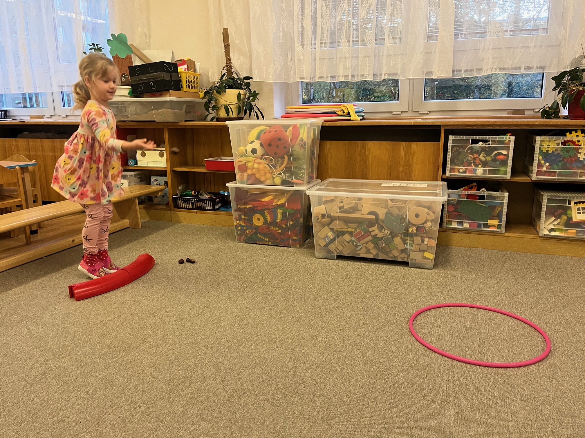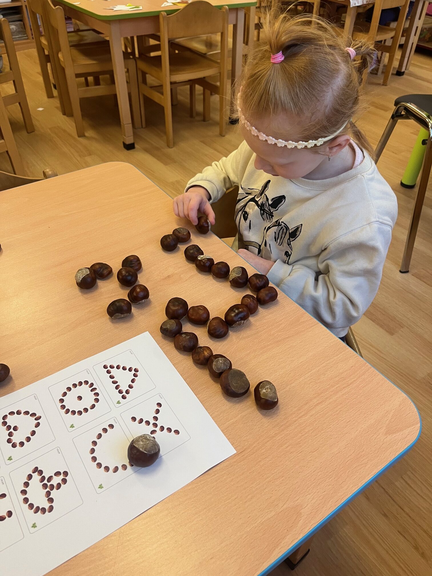 V centru pohybu děti podle znázorněné cesty v mapě hledaly cestu ven z bludiště (cestou pojmenovaly vše, co viděly) – tím jsme rozvíjeli prostorovou orientaci a slovní zásobu. Prostorovou orientaci i s pojmy před, za, na, vedle jsme si procvičili při umisťování ukrytých zvířátek do tabulky a při hledání cesty. V rámci pohybové aktivity děti trénovaly také hod, kdy se snažily trefit kaštanem do určeného místa. Kaštany děti využily také pro stavbu obrazců podle předlohy. Zrakové vnímání děti procvičovaly různámi skládačkami a doplňovačkami s podzimní tématikou. Pak nás čekal les plný jehličnatých stromů, kde jsme umisťovali stanovený počet šišek na strom (aktivitu jsme měli rozdělenou na složitější a jednodušší). Rozruch vzbudila i tajemná krabice, kde byly ukryty různé předměty a úkolem dětí bylo podle hmatu poznat, co je tam schované. Asi nejoblíbenější centrem byla sensory play aktivita, kde jsme vybírali vhodné potraviny pro veverku, pomocí trubek jsme je pouštěli veverce do úkrytu ve stromu. Ve výtvarném centru nás čekala výroba vlastní veverky. Zkusili jsme si pokus s vodou a krepovým papírem a tím jsme veverce zabarvili tělíčko. Na ocásek jsme použili také krepový papír, ale tentokrát jsme ho trhali a lepily. V rámci výtvarných aktivit děti čekala také výroba ježečka s využitím posbíraných listů. Fantazii děti také rozvíjely v průběhu celého týdne prostřednictvím podzimních omalovánek.
