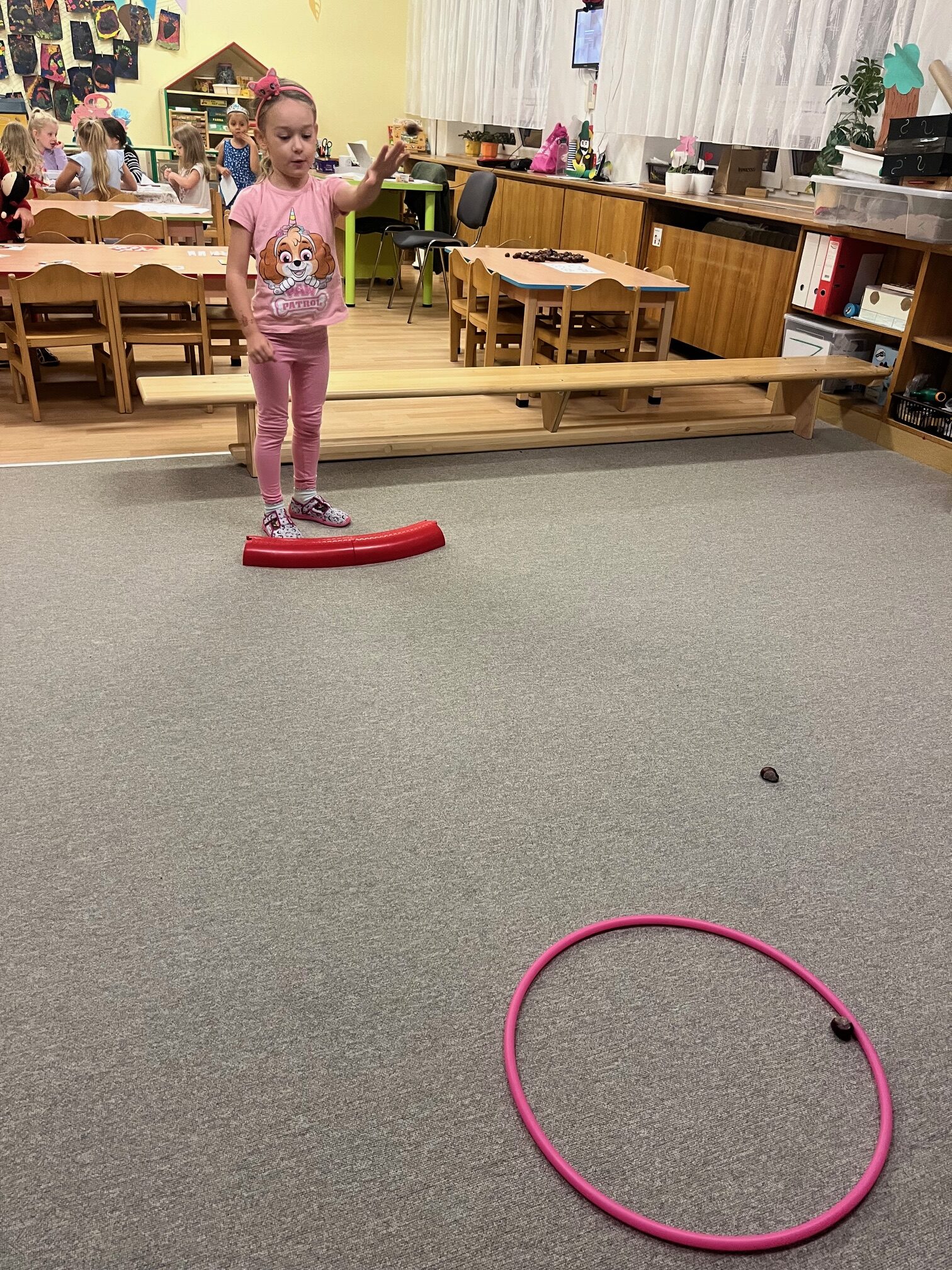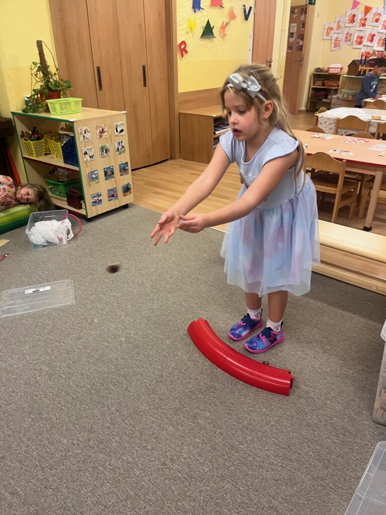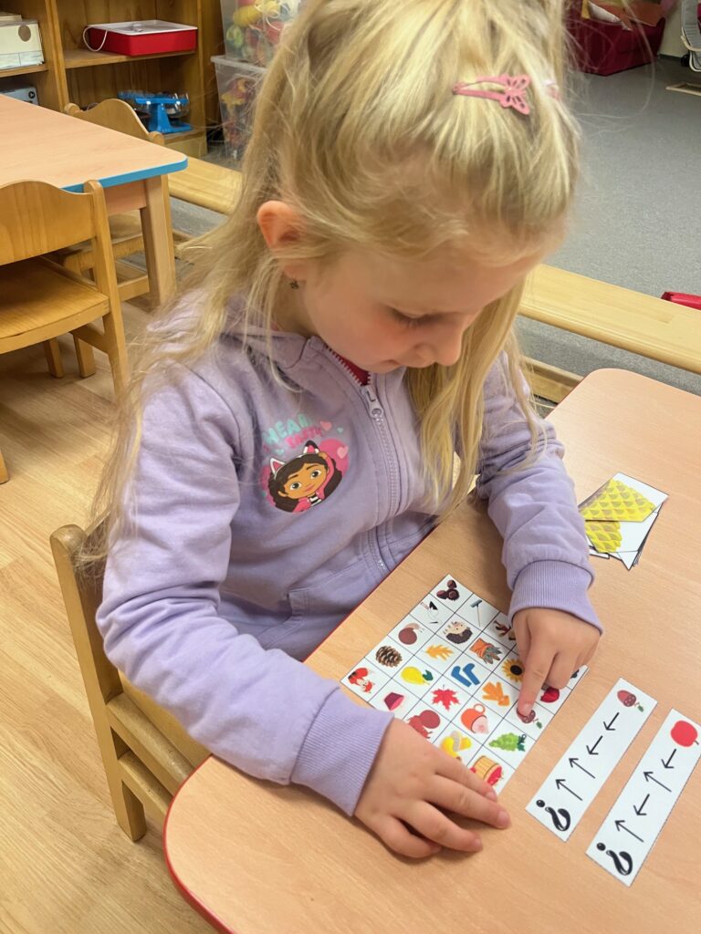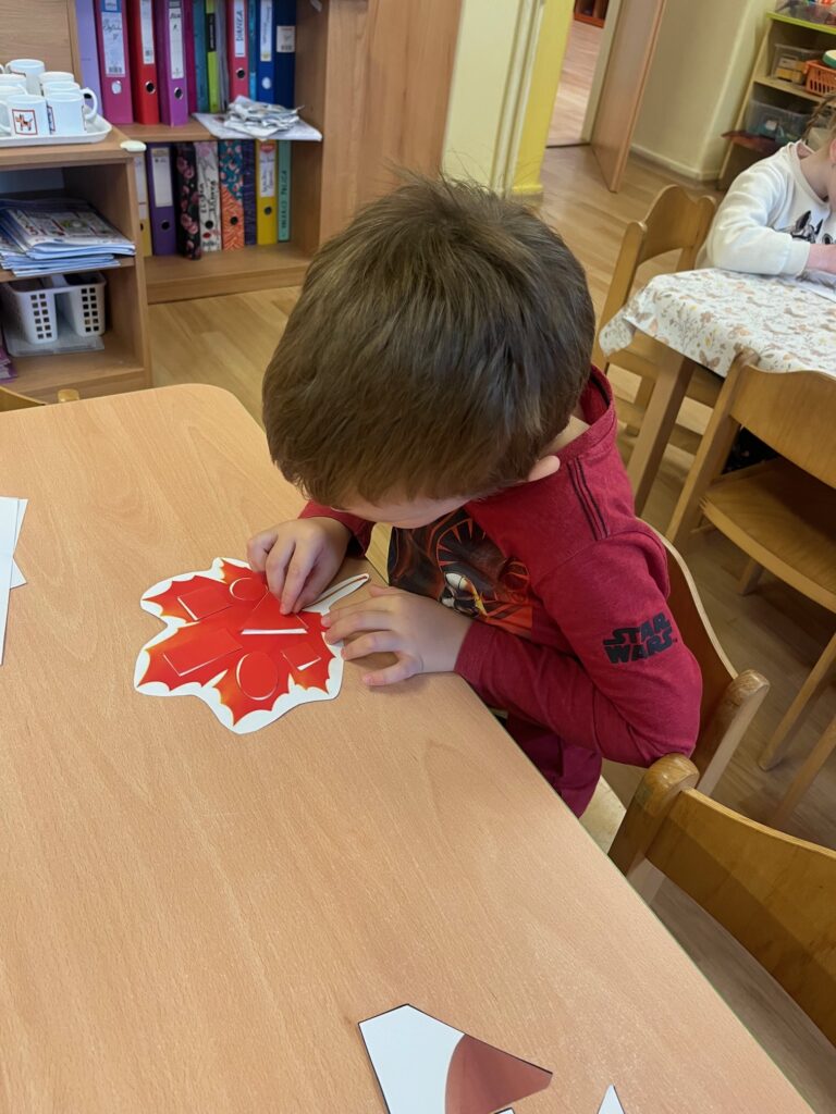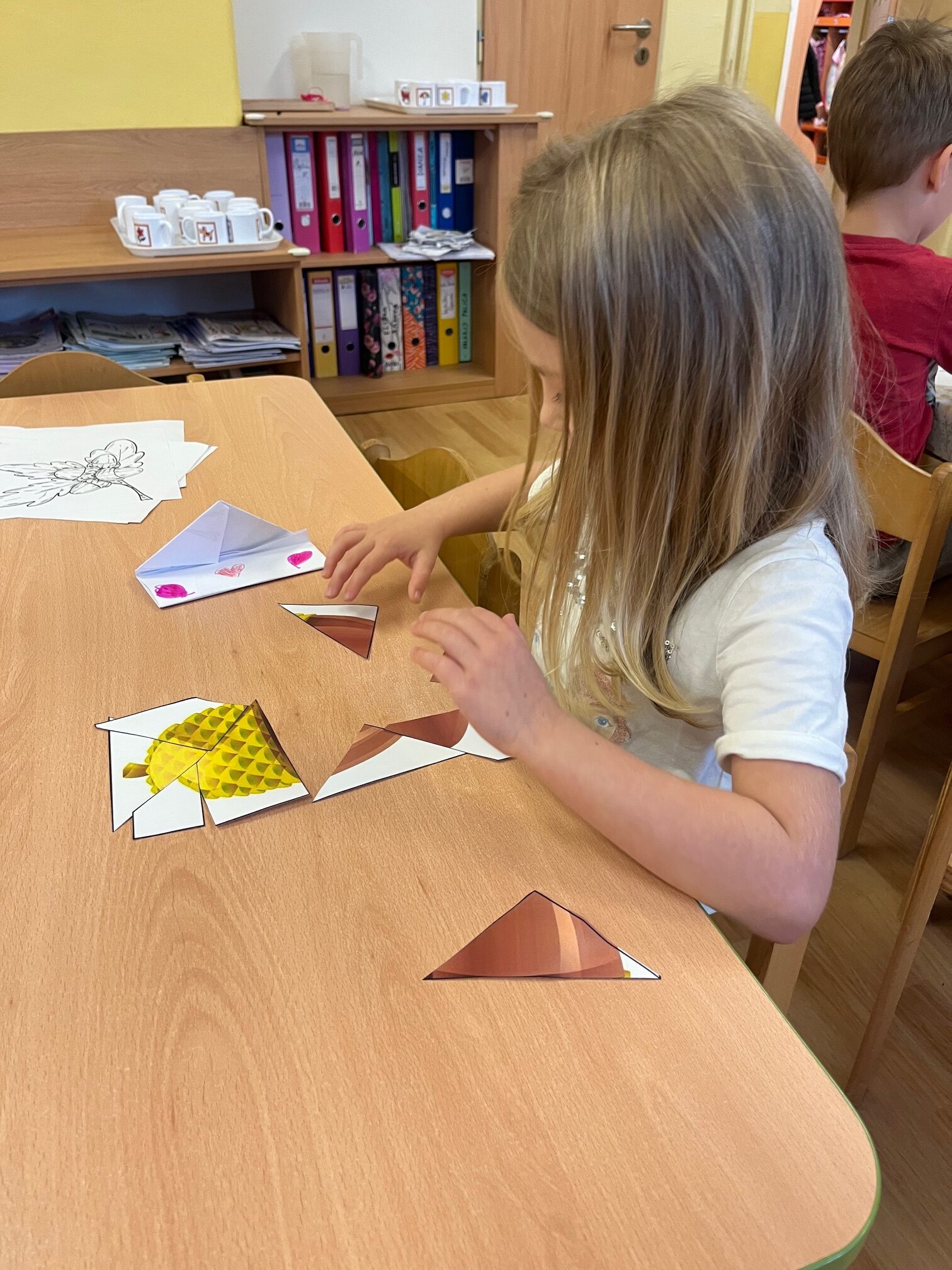 V centru pohybu děti podle znázorněné cesty v mapě hledaly cestu ven z bludiště (cestou pojmenovaly vše, co viděly) – tím jsme rozvíjeli prostorovou orientaci a slovní zásobu. Prostorovou orientaci i s pojmy před, za, na, vedle jsme si procvičili při umisťování ukrytých zvířátek do tabulky a při hledání cesty. V rámci pohybové aktivity děti trénovaly také hod, kdy se snažily trefit kaštanem do určeného místa. Kaštany děti využily také pro stavbu obrazců podle předlohy. Zrakové vnímání děti procvičovaly různámi skládačkami a doplňovačkami s podzimní tématikou. Pak nás čekal les plný jehličnatých stromů, kde jsme umisťovali stanovený počet šišek na strom (aktivitu jsme měli rozdělenou na složitější a jednodušší). Rozruch vzbudila i tajemná krabice, kde byly ukryty různé předměty a úkolem dětí bylo podle hmatu poznat, co je tam schované. Asi nejoblíbenější centrem byla sensory play aktivita, kde jsme vybírali vhodné potraviny pro veverku, pomocí trubek jsme je pouštěli veverce do úkrytu ve stromu. Ve výtvarném centru nás čekala výroba vlastní veverky. Zkusili jsme si pokus s vodou a krepovým papírem a tím jsme veverce zabarvili tělíčko. Na ocásek jsme použili také krepový papír, ale tentokrát jsme ho trhali a lepily. V rámci výtvarných aktivit děti čekala také výroba ježečka s využitím posbíraných listů. Fantazii děti také rozvíjely v průběhu celého týdne prostřednictvím podzimních omalovánek.