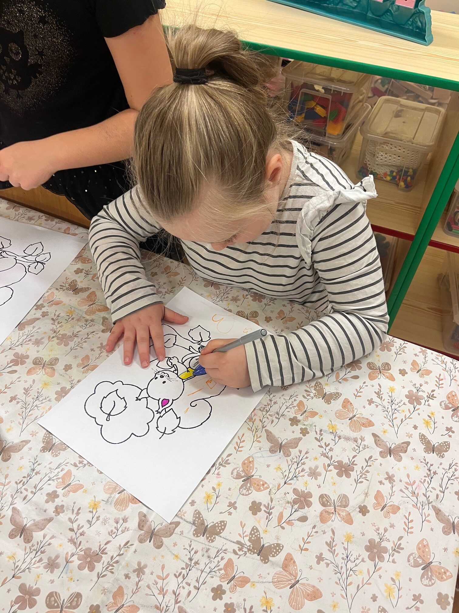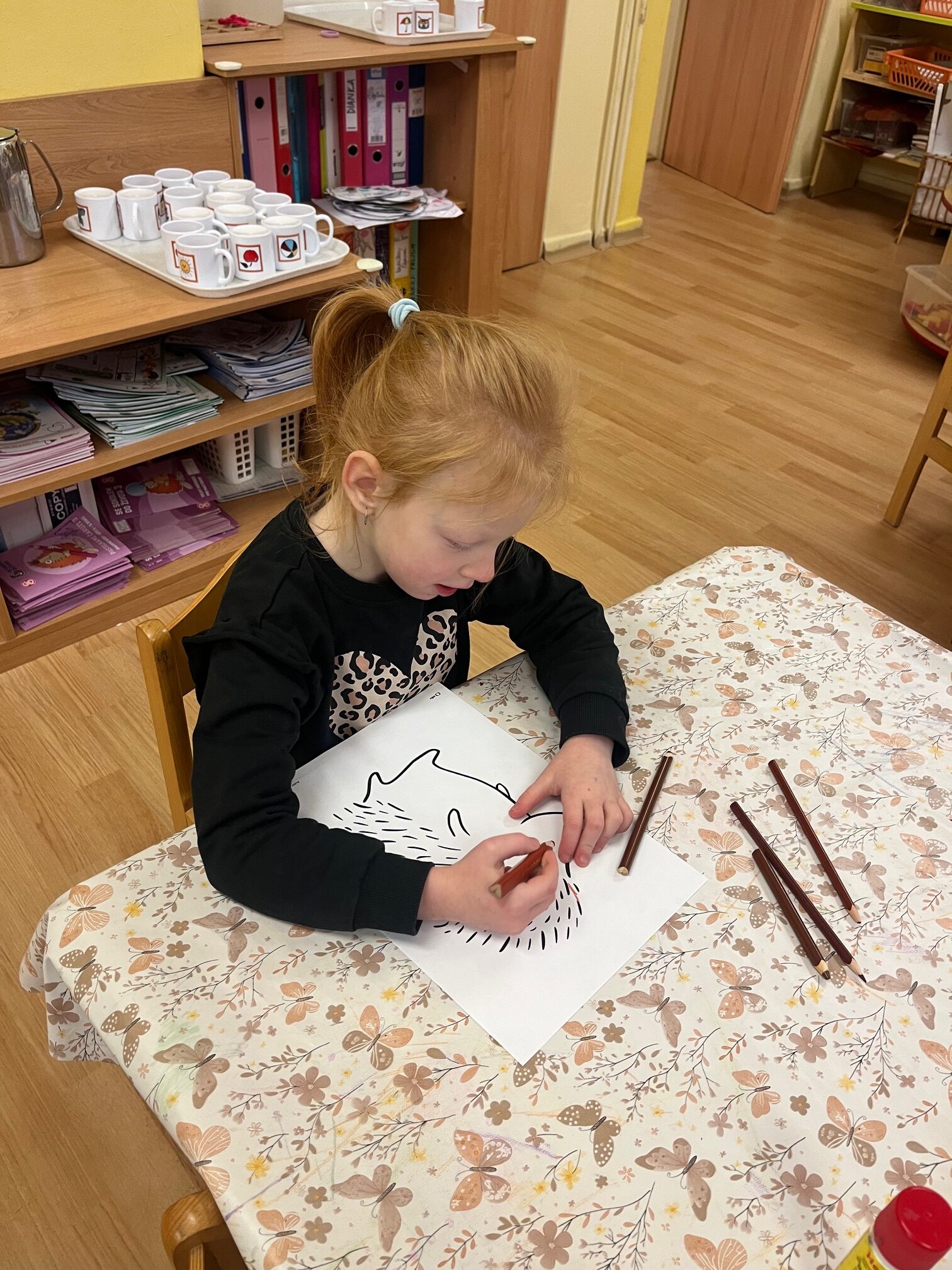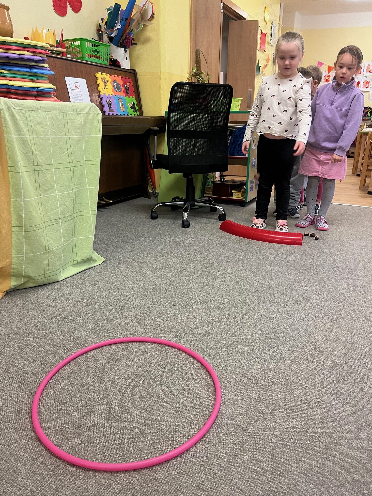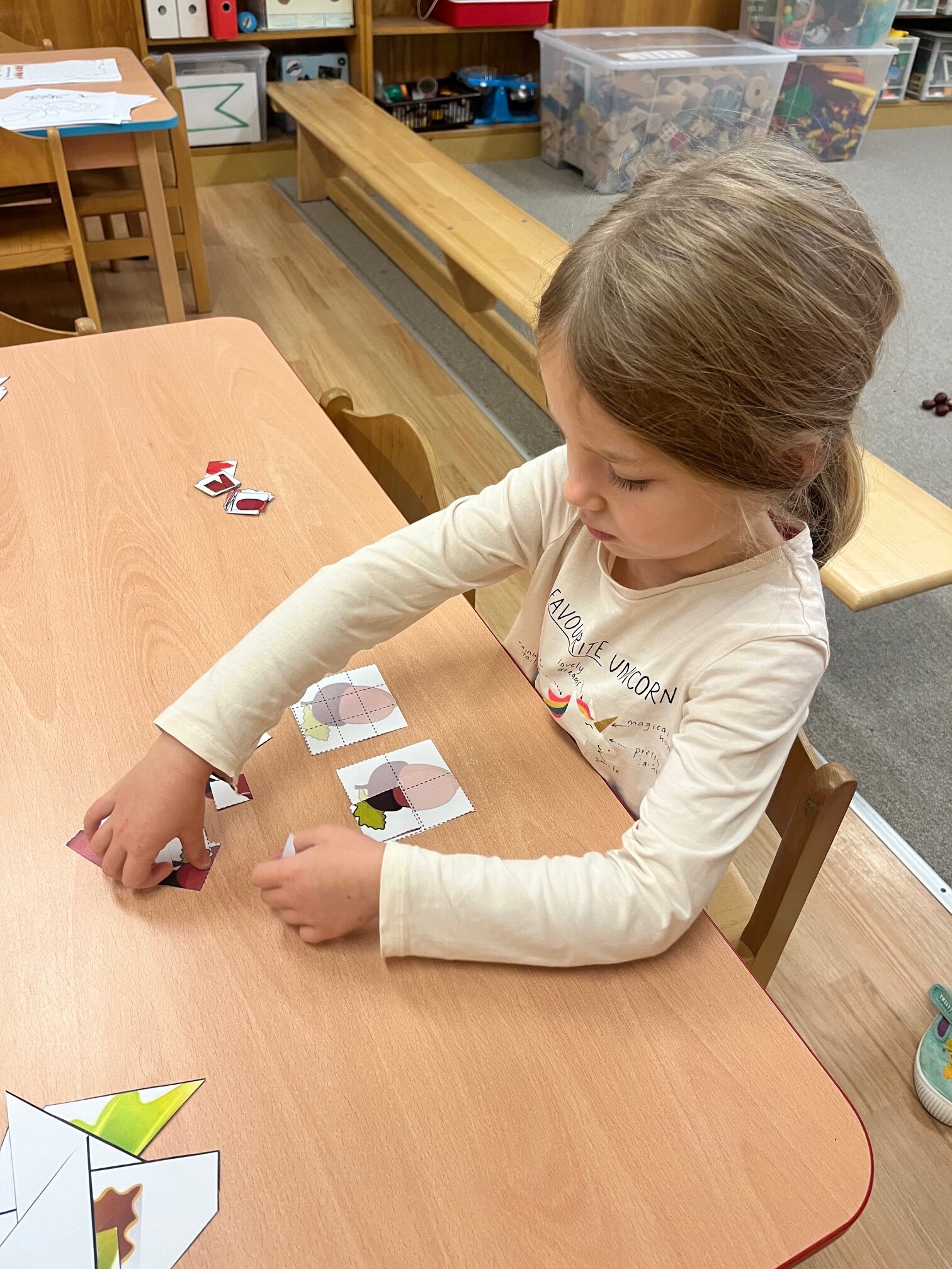 V centru pohybu děti podle znázorněné cesty v mapě hledaly cestu ven z bludiště (cestou pojmenovaly vše, co viděly) – tím jsme rozvíjeli prostorovou orientaci a slovní zásobu. Prostorovou orientaci i s pojmy před, za, na, vedle jsme si procvičili při umisťování ukrytých zvířátek do tabulky a při hledání cesty. V rámci pohybové aktivity děti trénovaly také hod, kdy se snažily trefit kaštanem do určeného místa. Kaštany děti využily také pro stavbu obrazců podle předlohy. Zrakové vnímání děti procvičovaly různámi skládačkami a doplňovačkami s podzimní tématikou. Pak nás čekal les plný jehličnatých stromů, kde jsme umisťovali stanovený počet šišek na strom (aktivitu jsme měli rozdělenou na složitější a jednodušší). Rozruch vzbudila i tajemná krabice, kde byly ukryty různé předměty a úkolem dětí bylo podle hmatu poznat, co je tam schované. Asi nejoblíbenější centrem byla sensory play aktivita, kde jsme vybírali vhodné potraviny pro veverku, pomocí trubek jsme je pouštěli veverce do úkrytu ve stromu. Ve výtvarném centru nás čekala výroba vlastní veverky. Zkusili jsme si pokus s vodou a krepovým papírem a tím jsme veverce zabarvili tělíčko. Na ocásek jsme použili také krepový papír, ale tentokrát jsme ho trhali a lepily. V rámci výtvarných aktivit děti čekala také výroba ježečka s využitím posbíraných listů. Fantazii děti také rozvíjely v průběhu celého týdne prostřednictvím podzimních omalovánek.