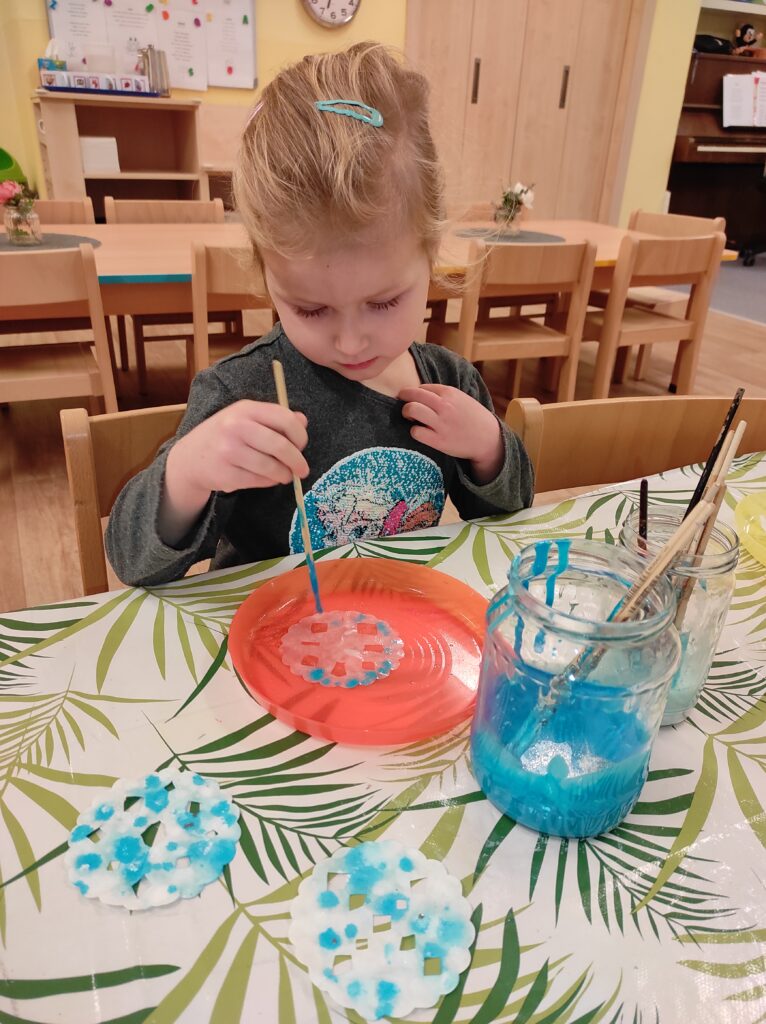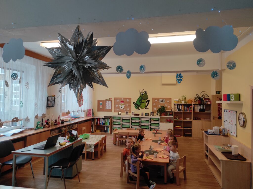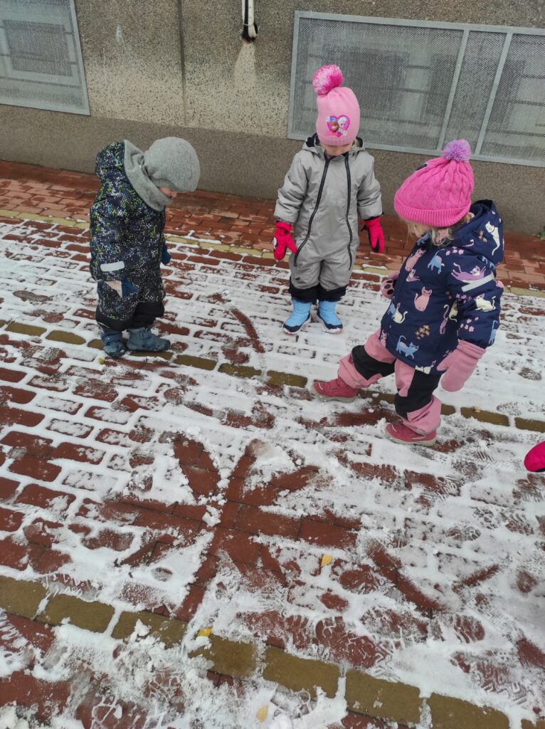 Tento týden jsme si užívali opravdové zimní radovánky. Hned v pondělí jsme vyrazili ven do čerstvě napadaného sněhu – pozorovali jsme ptačí stopy, zkoumali ty naše, kreslili jsme do sněhu, prošlapávali cestičky a společně postavili malého sněhuláka. Povídali jsme si také o ptačí budce na školní zahradě – k čemu slouží a co do ní můžeme ptáčkům nasypat. Ve třídě jsme zkoumali, jak se sníh postupně mění na vodu a všímali jsme si, jak je voda po roztátí znečištěná. Celý týden jsme se věnovali také tvoření – zapouštěním barev jsme si vyrobili krásné sněhové vločky, které jsme použili na zimní výzdobu naší třídy.