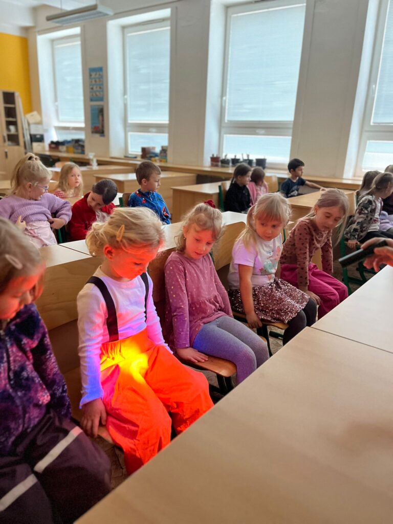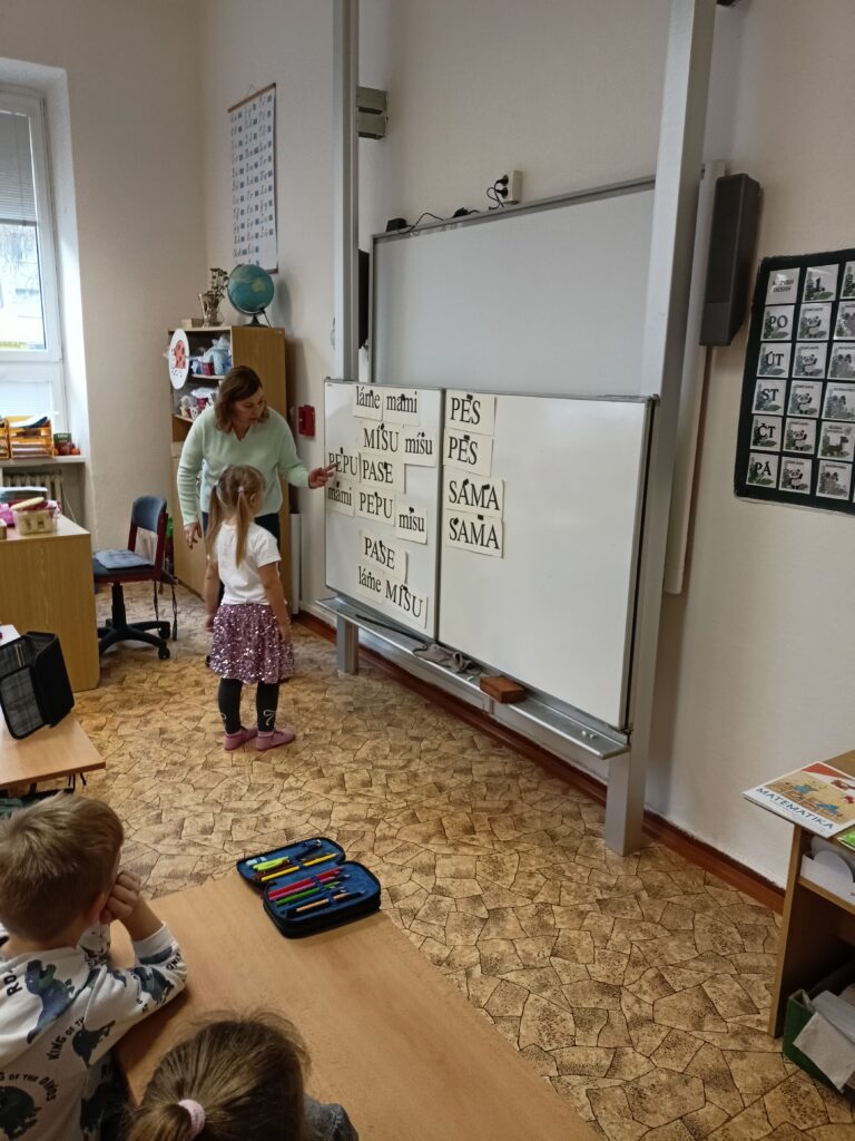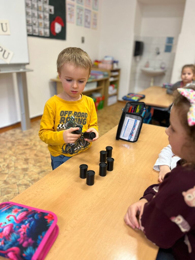 Ve středu 3. prosince 2025 byly děti z naší MŠ (vybraní předškoláci a děti, které chodí do klubu Koumáci) pozvány na ukázkovou hodinu do ZŠ Dětská. Nejprve jsme navštívili první třídu a na chvíli se zúčastnili hodiny českého jazyka. Paní učitelka zapojila do plnění úkolů i děti z MŠ. Poté jsme se přemístili do přírodovědné učebny, kde měl pro nás pan učitel nachystány zajímavé pokusy na téma Barvy a světlo. Děti si také mohly v digitálních mikroskopech prohlédnout části těla hmyzu a zvětšené průduchy rostliny. Nakonec hodiny byly děti za svou šikovnost odměněny diplomem a medailí. Ukázková hodina se nám všem moc líbila a těšíme se na další spolupráci se ZŠ.