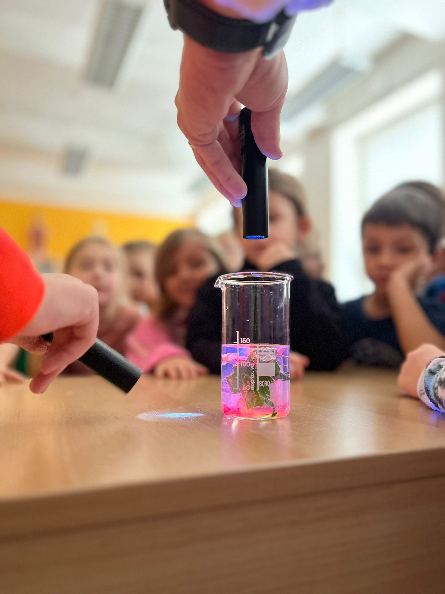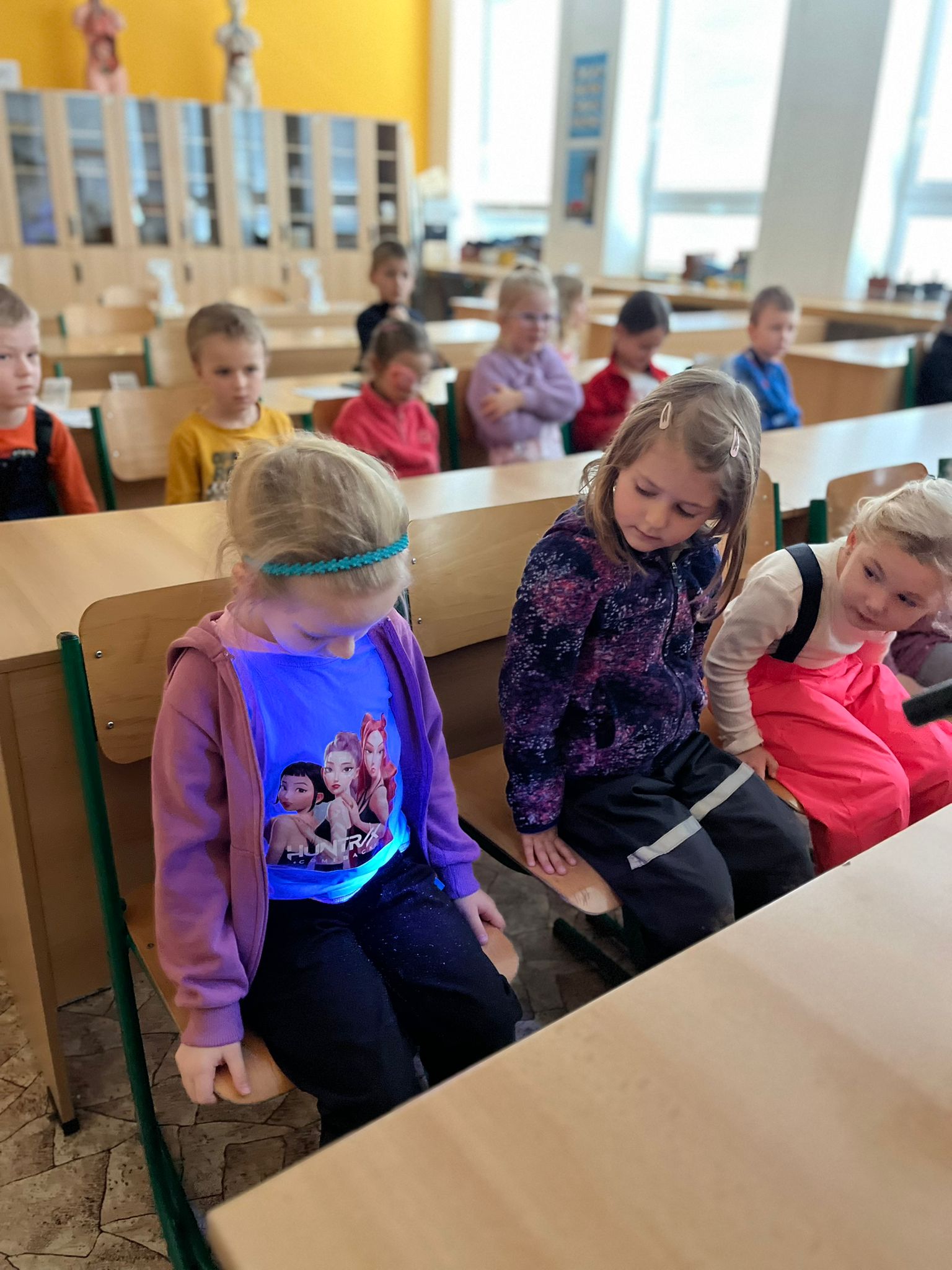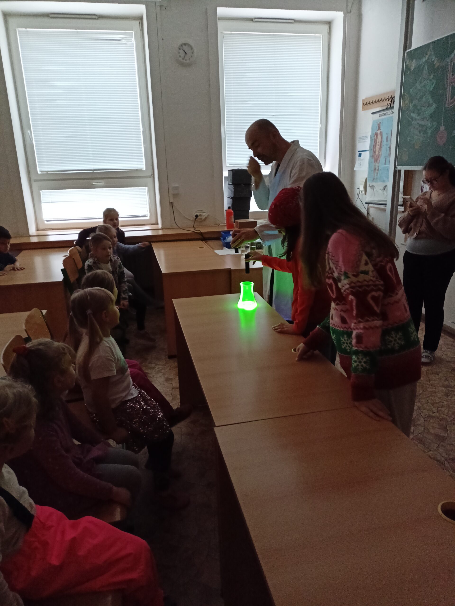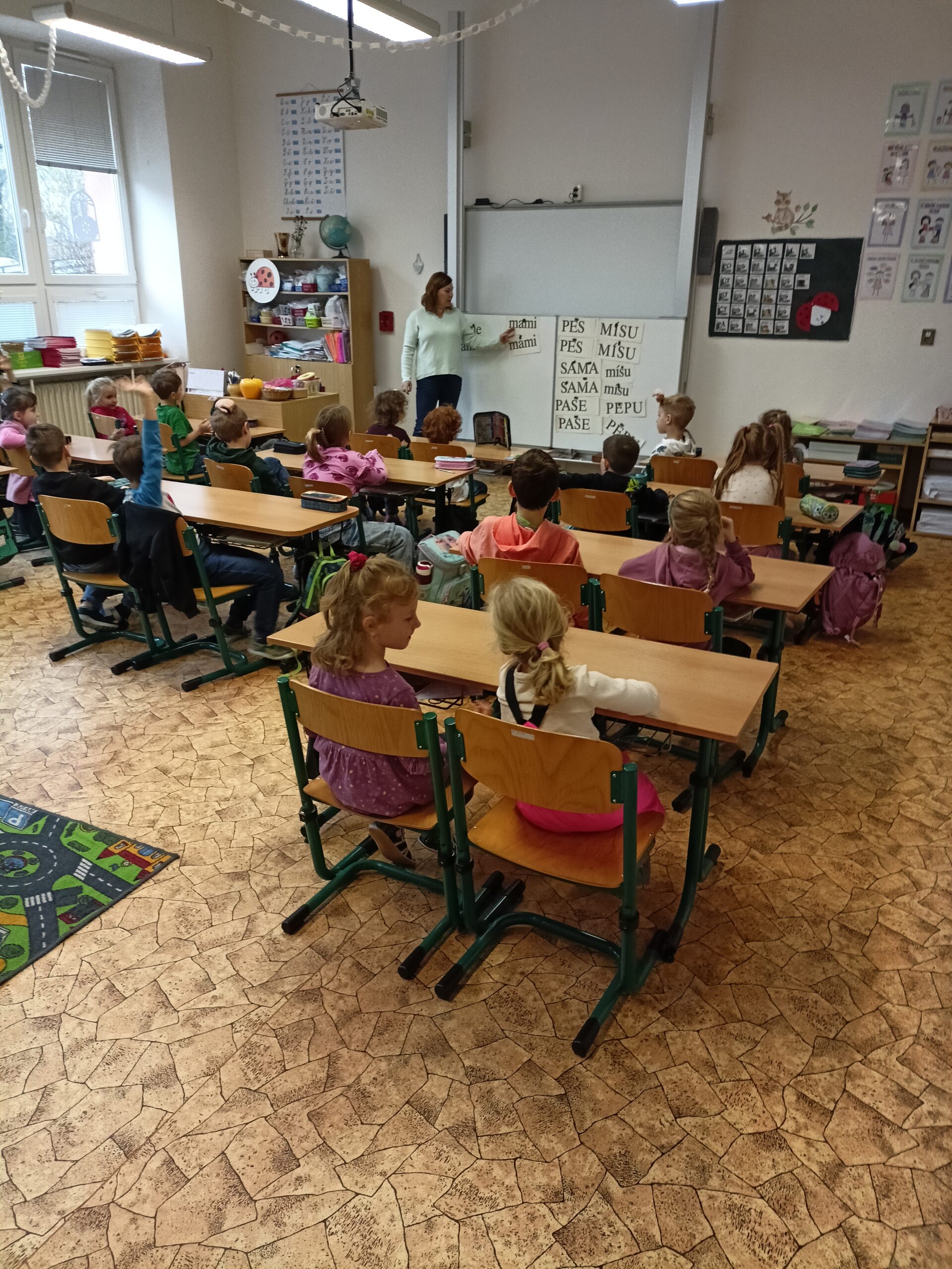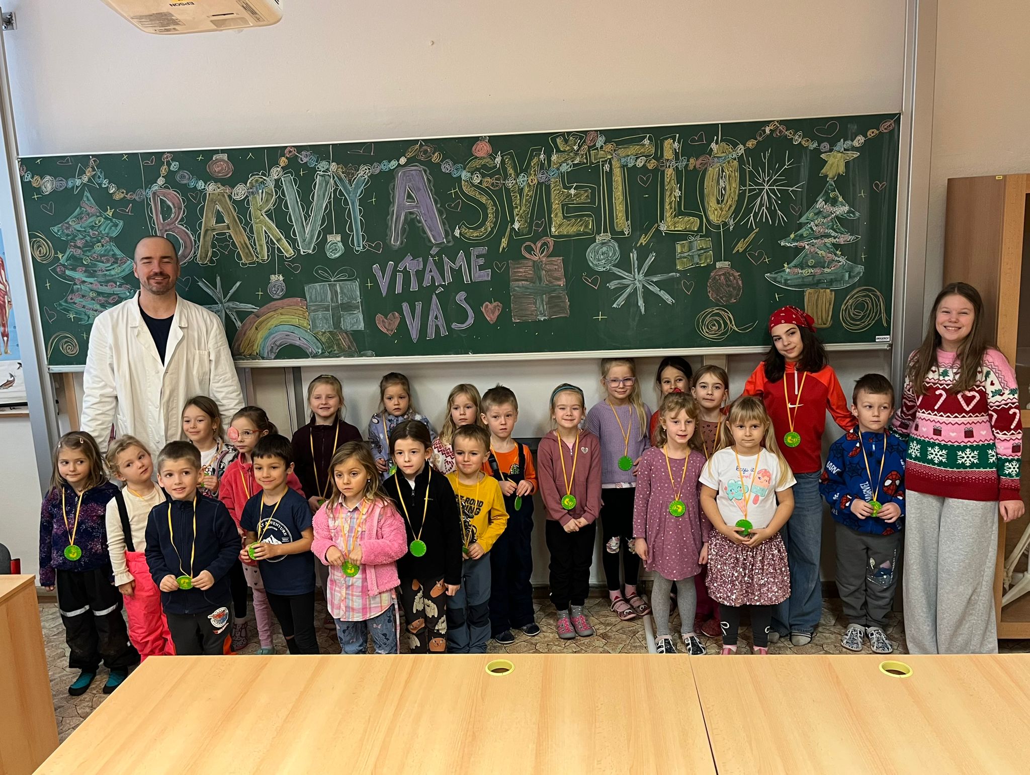 Ve středu 3. prosince 2025 byly děti z naší MŠ (vybraní předškoláci a děti, které chodí do klubu Koumáci) pozvány na ukázkovou hodinu do ZŠ Dětská. Nejprve jsme navštívili první třídu a na chvíli se zúčastnili hodiny českého jazyka. Paní učitelka zapojila do plnění úkolů i děti z MŠ. Poté jsme se přemístili do přírodovědné učebny, kde měl pro nás pan učitel nachystány zajímavé pokusy na téma Barvy a světlo. Děti si také mohly v digitálních mikroskopech prohlédnout části těla hmyzu a zvětšené průduchy rostliny. Nakonec hodiny byly děti za svou šikovnost odměněny diplomem a medailí. Ukázková hodina se nám všem moc líbila a těšíme se na další spolupráci se ZŠ.