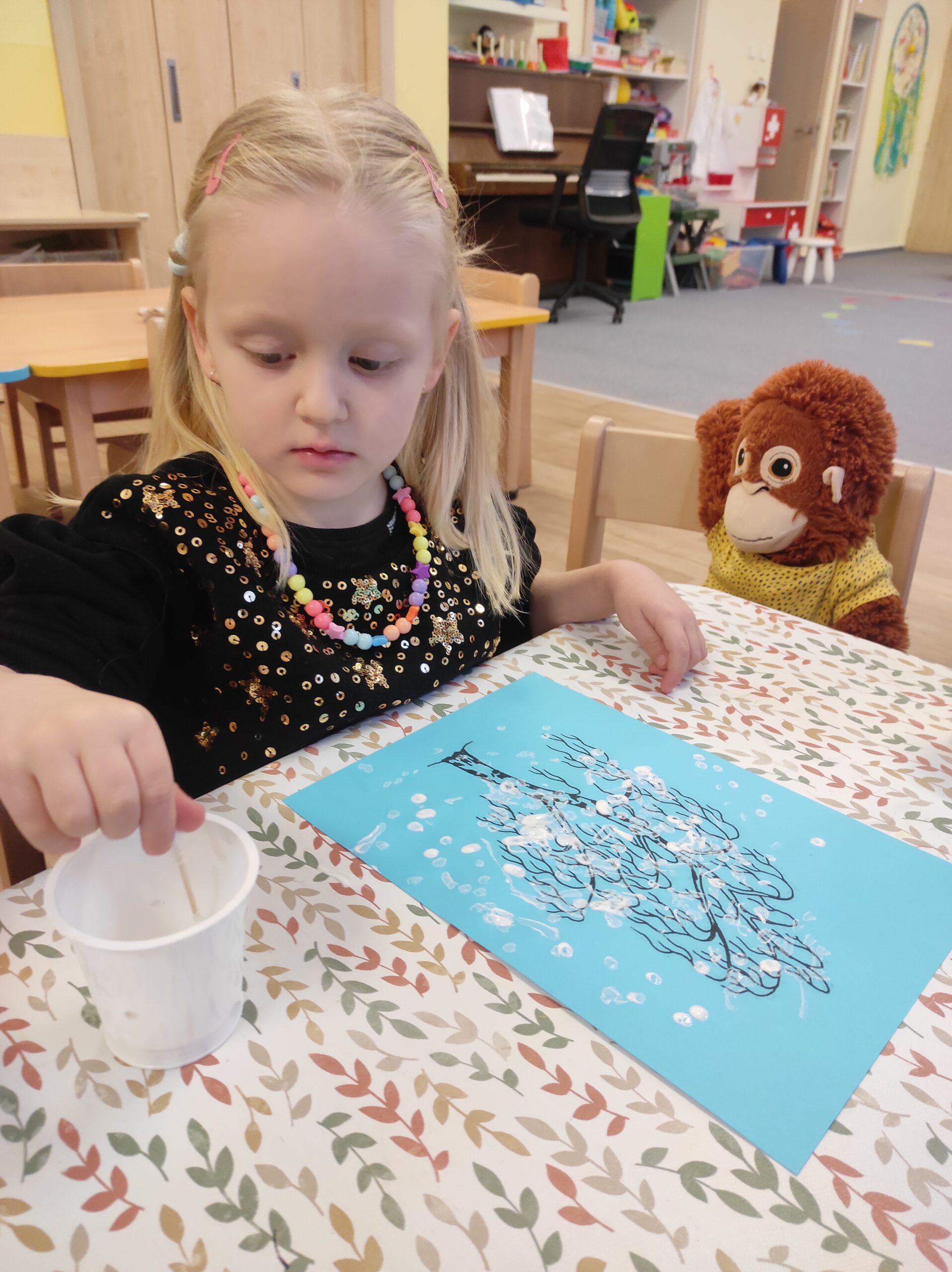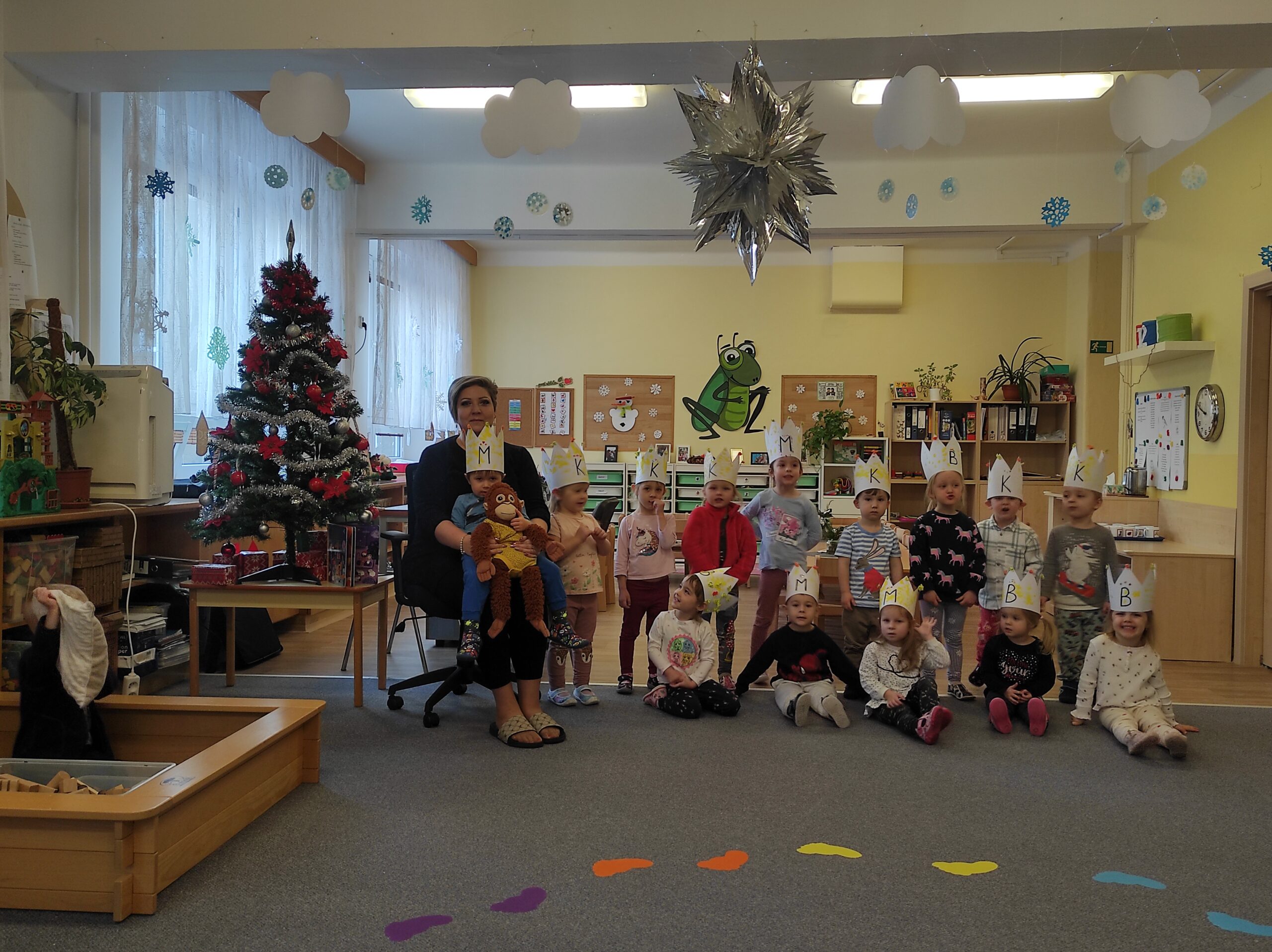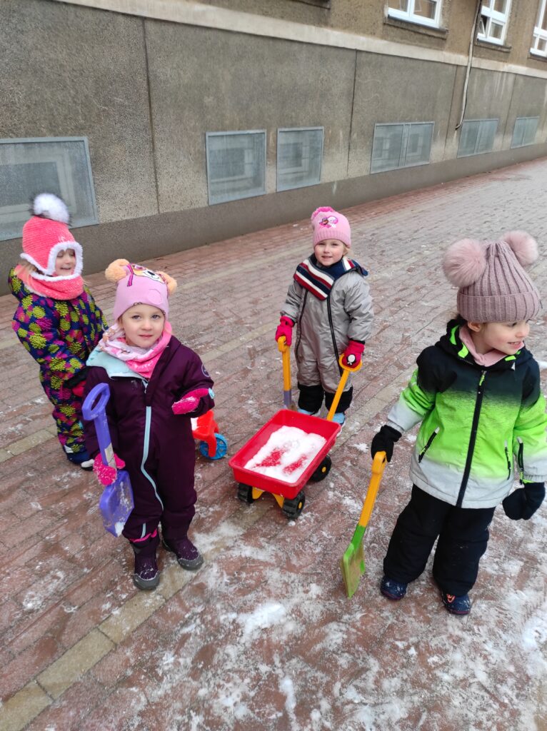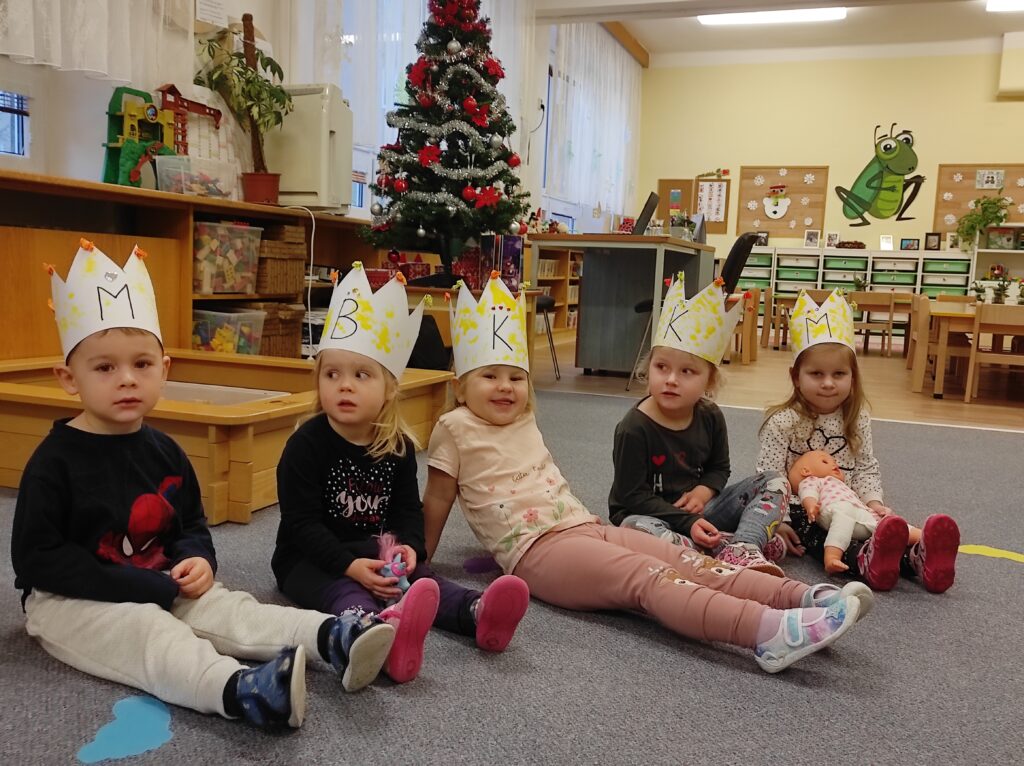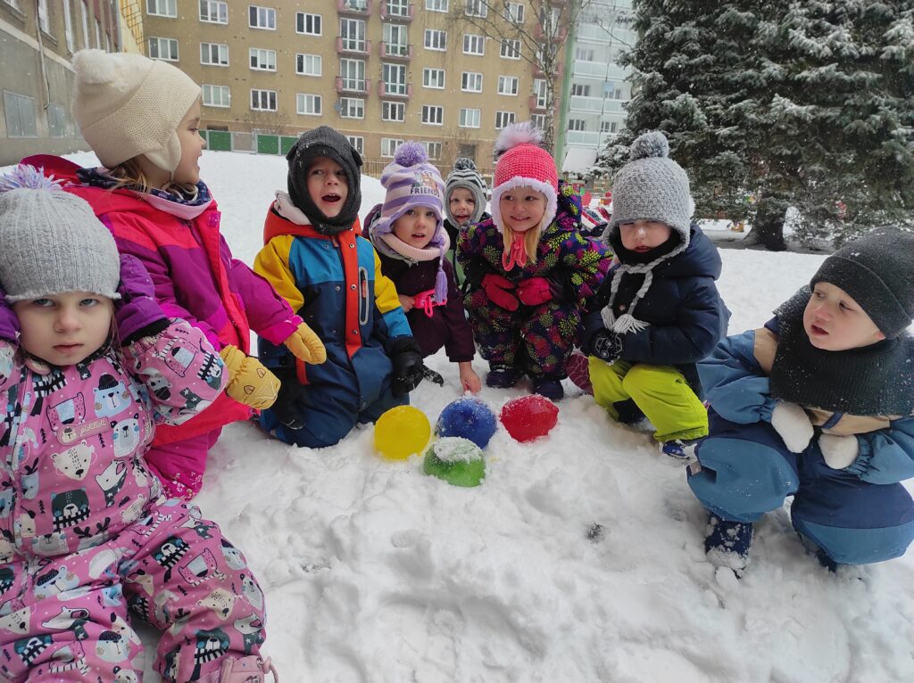 Tento týden jsme si první dva dny povídali o Třech králích. Zhlédli jsme krátký příběh Chaloupka na vršku – Tři králové a vyrobili si vlastní královské koruny. Konečně napadl sníh, a tak jsme si užili zimní hrátky na školní zahradě. Při výtvarné aktivitě „Zasněžená bříza v závěji“ jsme se naučili novou rytmickou báseň, se kterou jsme dále pracovali i při hudebních činnostech. Mrazivé počasí, které nás čekalo i o víkendu, jsme využili k pátečnímu experimentu a vyrobili si barevné ledové koule.