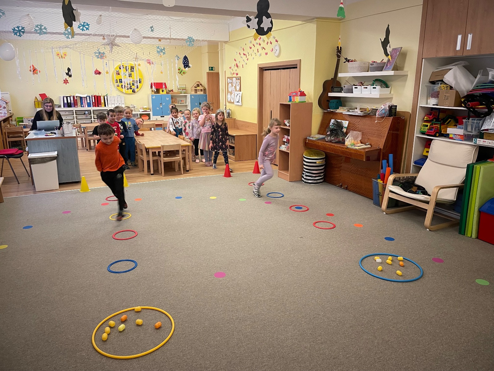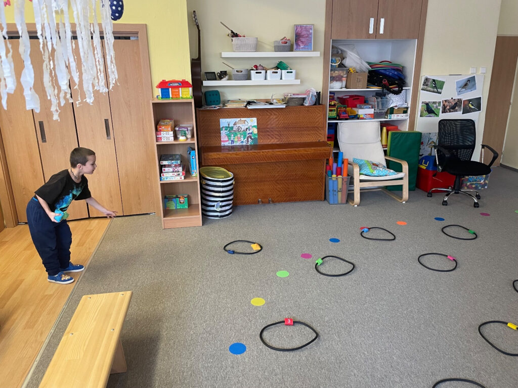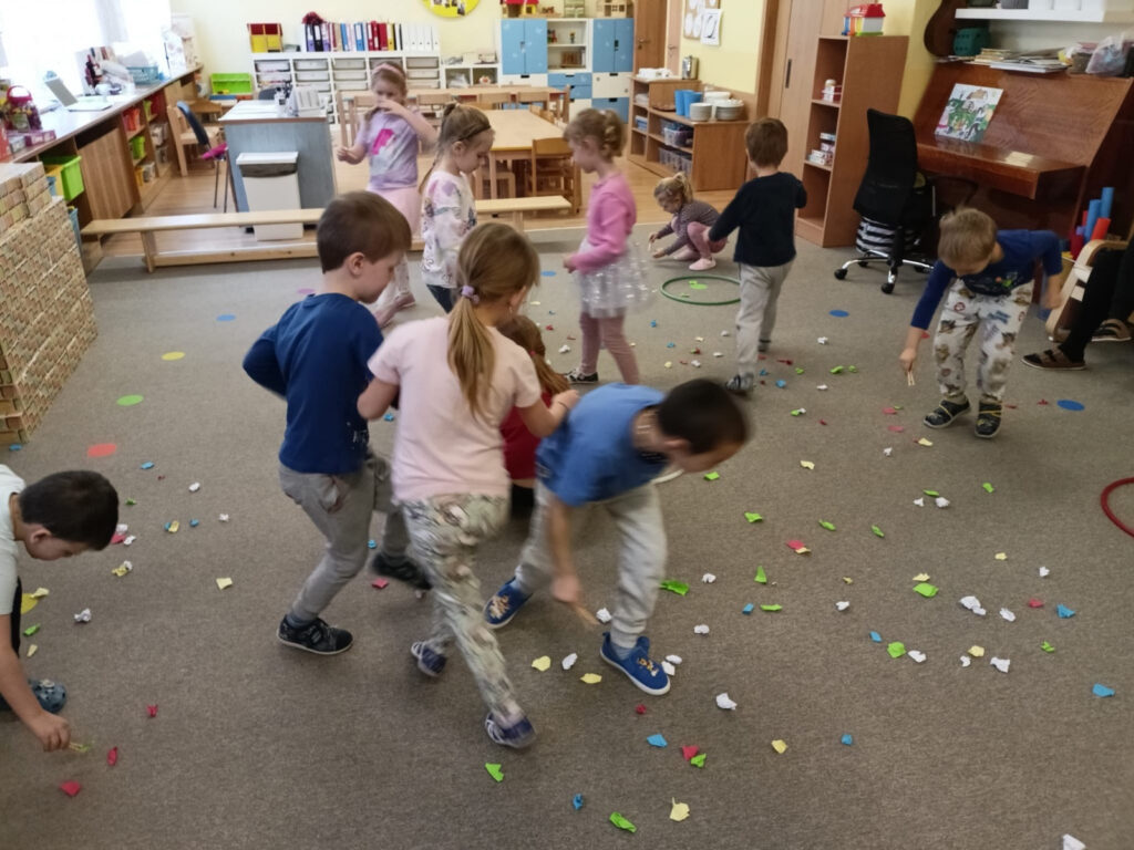 Nové znalosti jsme propojili i s pohybem. Při motivovaném cvičení se z dětí stali ptáčci, kteří si protahovali křidélka, zobali zrníčka nebo se v letu vyhýbali kocourovi. Velmi nás bavily také třídicí hry, při kterých děti v pohybu rozdělovaly potravu – hravě si poradily s tím, co do krmítka patří (semínka, oříšky) a co by ptáčkům naopak ublížilo. Kromě nových informací tak děti rozvíjely svou obratnost, postřeh a logické myšlení.