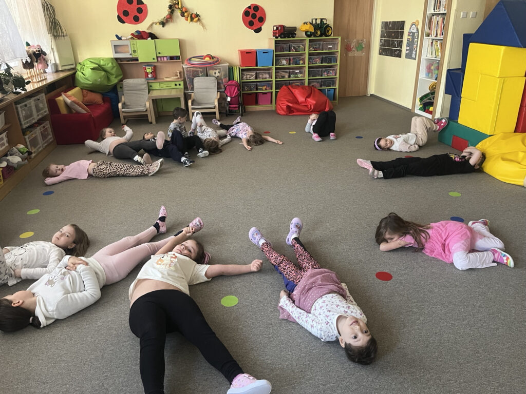 Součástí týdne byly i pohybové hry, které dětem přinesly radost z pohybu a zároveň podpořily jejich smyslové vnímání. Děti si zahrály například hry „Chodí bacil okolo“, „Dotkni se země“, „Najdi zvuk zvonečku“ nebo „Čáp ztratil čepičku“. Při těchto aktivitách si uvědomovaly své tělo, reagovaly na pokyny a učily se vnímat prostor i zvuky kolem sebe.