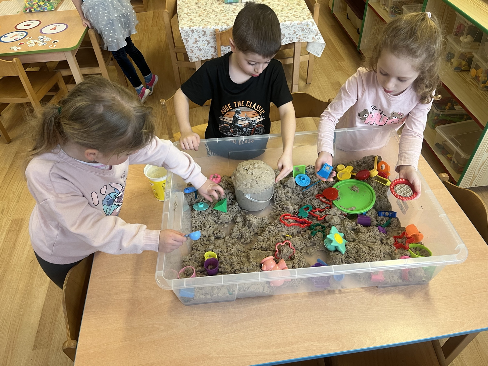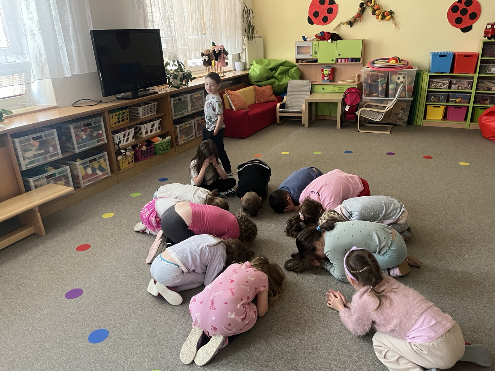 Součástí týdne byly i pohybové hry, které dětem přinesly radost z pohybu a zároveň podpořily jejich smyslové vnímání. Děti si zahrály například hry „Chodí bacil okolo“, „Dotkni se země“, „Najdi zvuk zvonečku“ nebo „Čáp ztratil čepičku“. Při těchto aktivitách si uvědomovaly své tělo, reagovaly na pokyny a učily se vnímat prostor i zvuky kolem sebe.