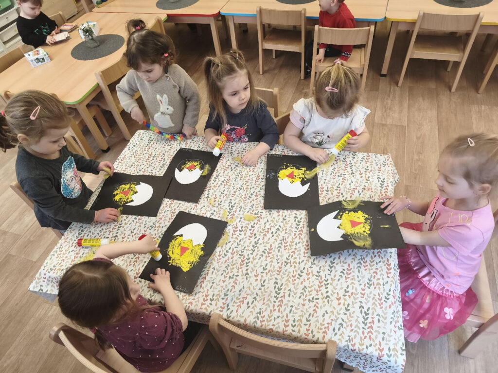 Na závěr týdne děti své prožitky výtvarně ztvárnily – vytvořily kuřátko pomocí techniky obtiskování barvy brčkem a následně dolepily detaily. Vznikla tak krásná a originální díla, která zachycují jejich bezprostřední radost z celého projektu.