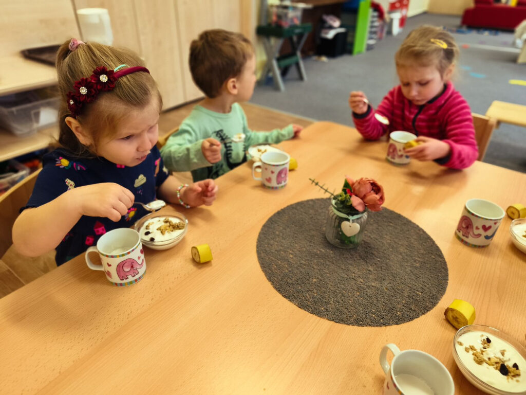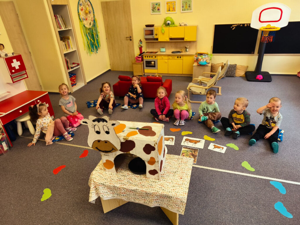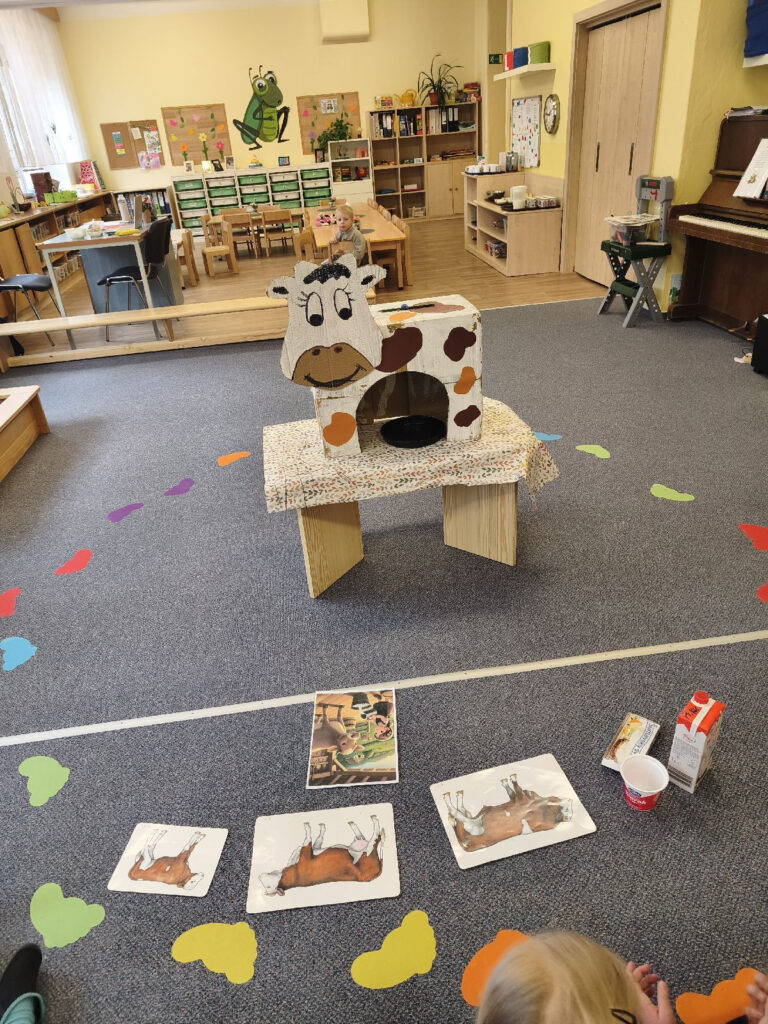 Podrobněji jsme se zaměřily na krávu. Povídaly jsme si o tom, odkud pochází mléko a jaké produkty se z něj vyrábějí. Děti si prakticky vyzkoušely „dojení“ a měly možnost ochutnat mléčné výrobky – jogurt a mléko, které s chutí snědly. Aktivita byla motivována příběhem o kravičce Líze, což podpořilo jejich zájem i představivost.