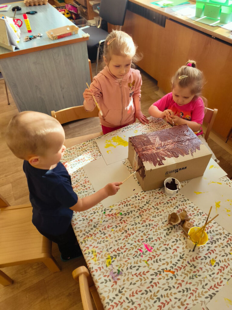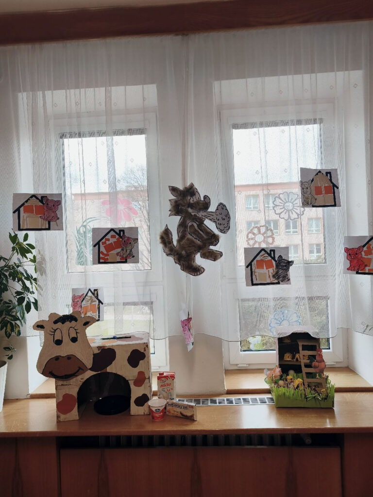 Součástí týdne byla také tvořivá činnost – děti si vyrobily kurník s kuřátky, čímž rozvíjely svou kreativitu a pracovní dovednosti. Nechyběla ani dramatizace pohádky O třech prasátkách, při které si děti procvičily vyjadřovací schopnosti, spolupráci a sociální dovednosti.