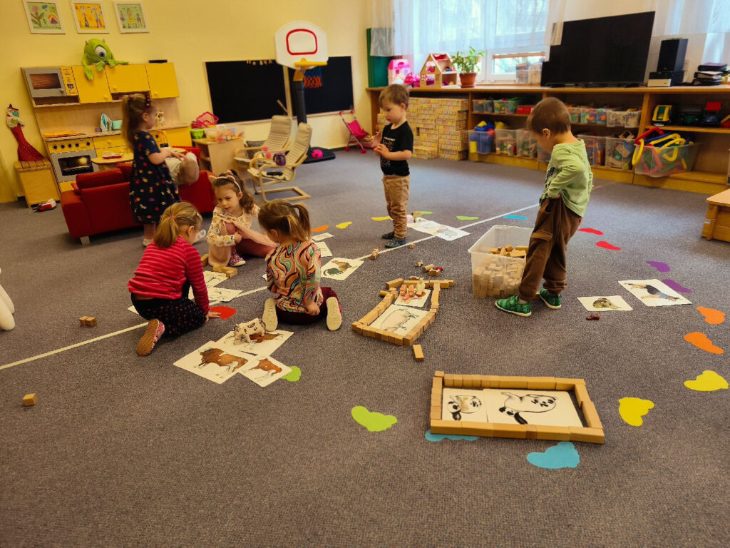 Děti se seznamovaly s domácími zvířaty a jejich významem pro člověka. Prostřednictvím her a praktických činností si vyzkoušely péči o zvířata a rozvíjely své poznatky o jejich životě. Společně jsme stavěly farmu z dřevěných kostek, čímž děti rozvíjely svou představivost, spolupráci i jemnou motoriku.
