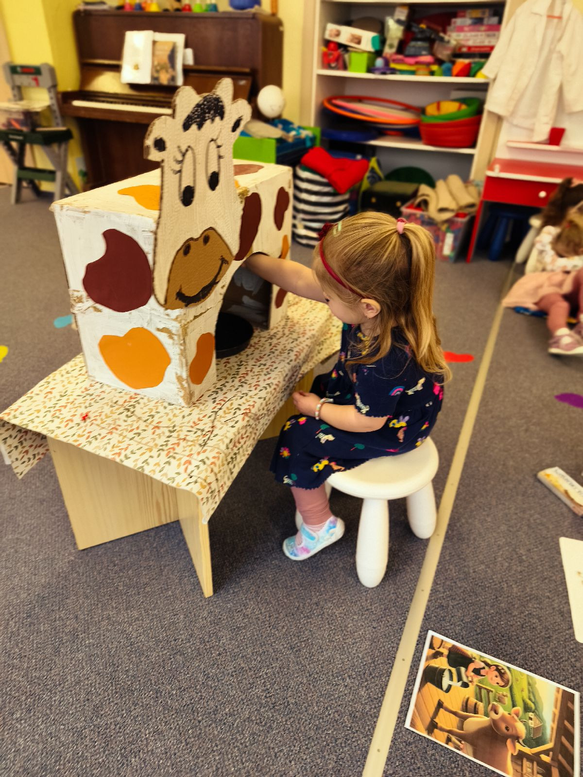 Podrobněji jsme se zaměřily na krávu. Povídaly jsme si o tom, odkud pochází mléko a jaké produkty se z něj vyrábějí. Děti si prakticky vyzkoušely „dojení“ a měly možnost ochutnat mléčné výrobky – jogurt a mléko, které s chutí snědly. Aktivita byla motivována příběhem o kravičce Líze, což podpořilo jejich zájem i představivost.
