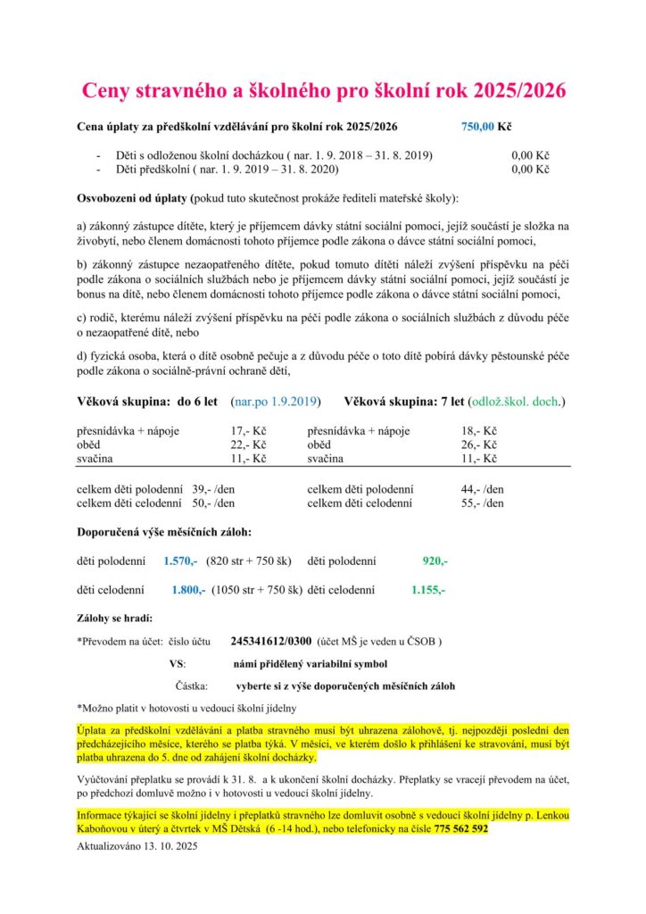 Platby Úplata za předškolní vzdělávání V případě přeplatků na stravném a úplatě kontaktujte vedoucí ŠJ 775 562 592.